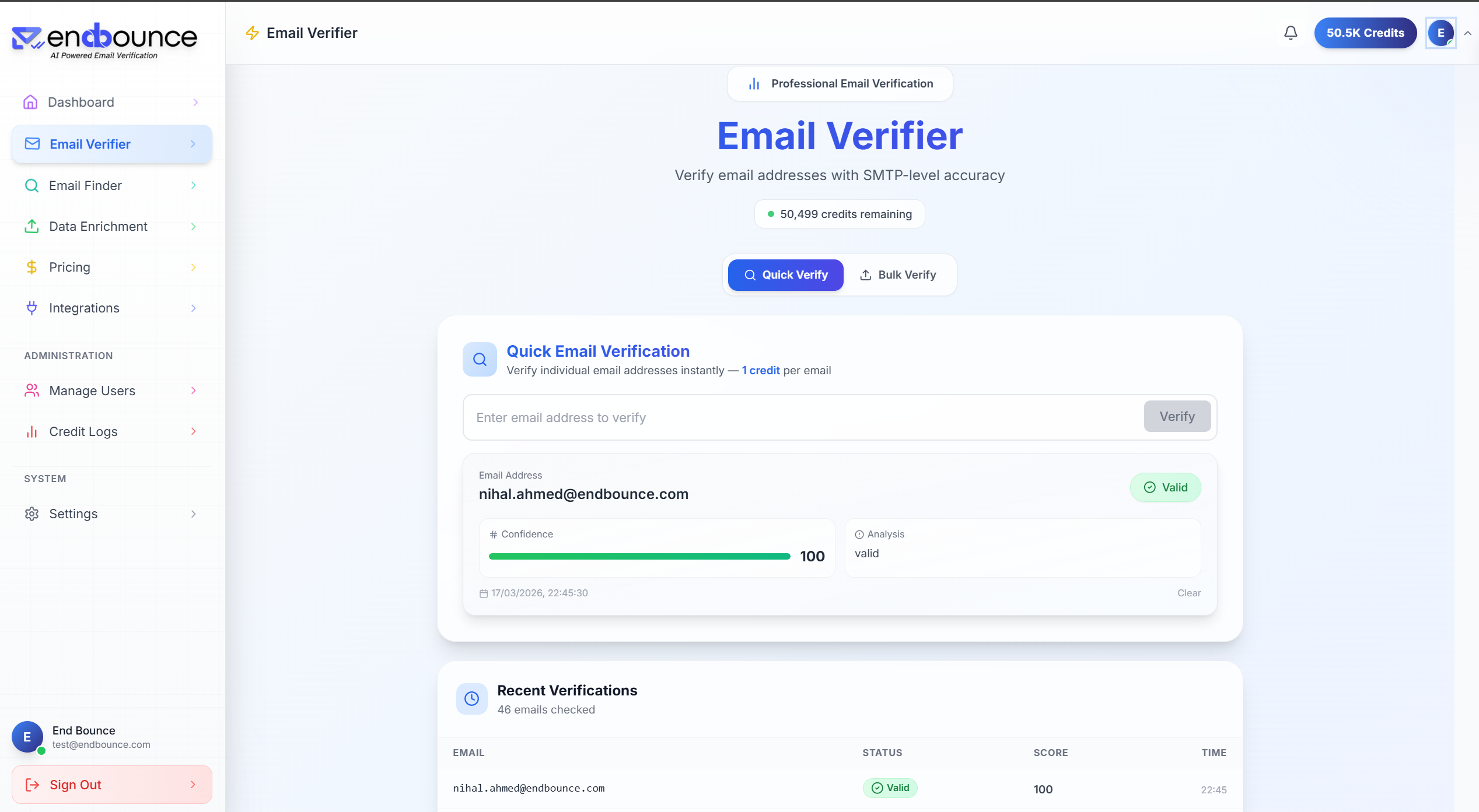 EndBounce uses AI algorithms with real-time SMTP verification to deliver 99.9% accurate email validation. Verify emails, find contacts, and enhance your lists — all in one platform.
